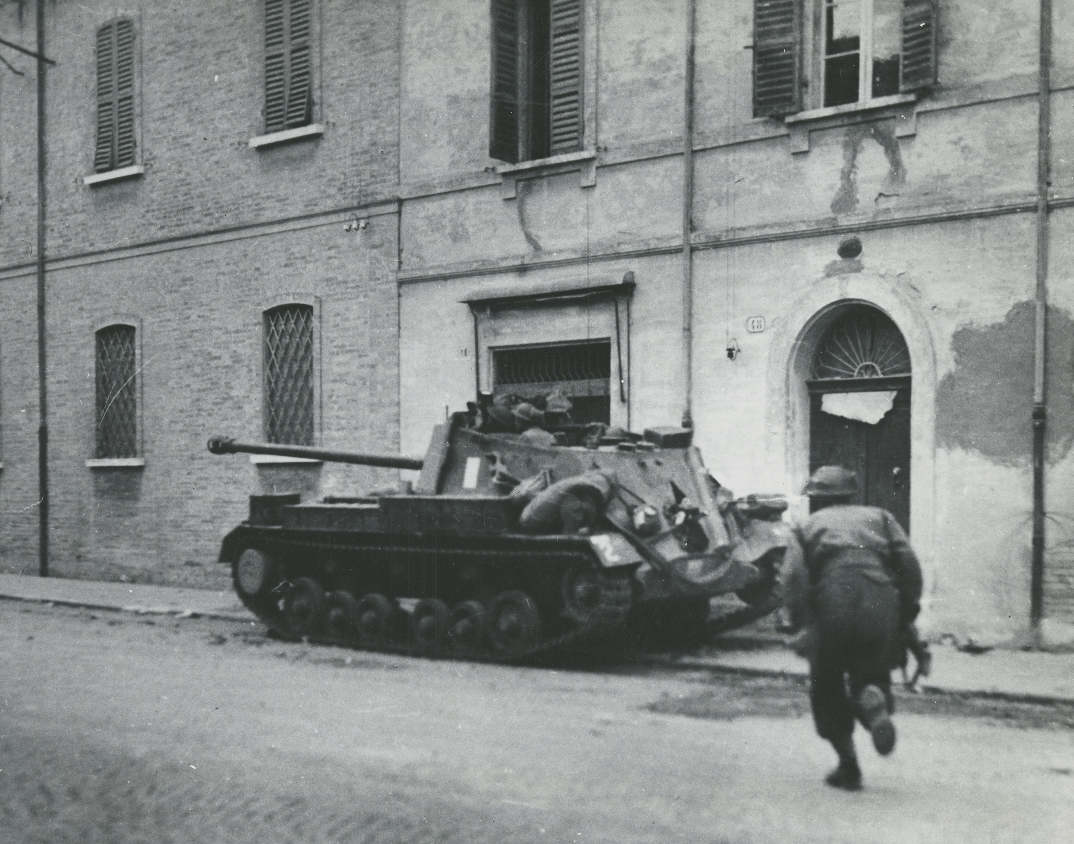 The German withdrawal from the railway embankment had been hastened by the actions of an aggressive battle group leading 5th Armoured Division’s advance to Ravenna. The Princess Louise Dragoon Guards and the Lanark and Renfrew Scottish Regt. led while the Westminster Regt. captured a vital crossing of the Montone River, opening up a supply route. The operations log of 12th Bde. proudly recorded the results of this speedy and successful advance that carried the brigade “through the enemy’s delaying line (the railway) east of the River Lamone.”
